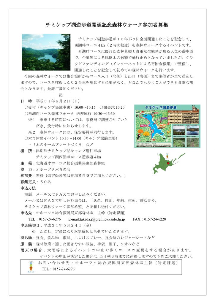 トップページ お知らせ チミケップ湖遊歩道開通記念森林ウォーク参加者募集