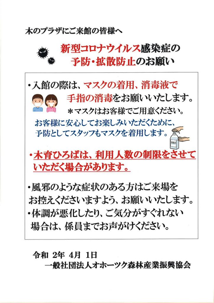 現在、オホーツク総合振興局管内では、一定程度、新型コロナウイルスの感染拡大が抑えられている状況にあることより、 4月1日(水)から感染防止策を講じた上で、オホーツク木のプラザも開館いたします。