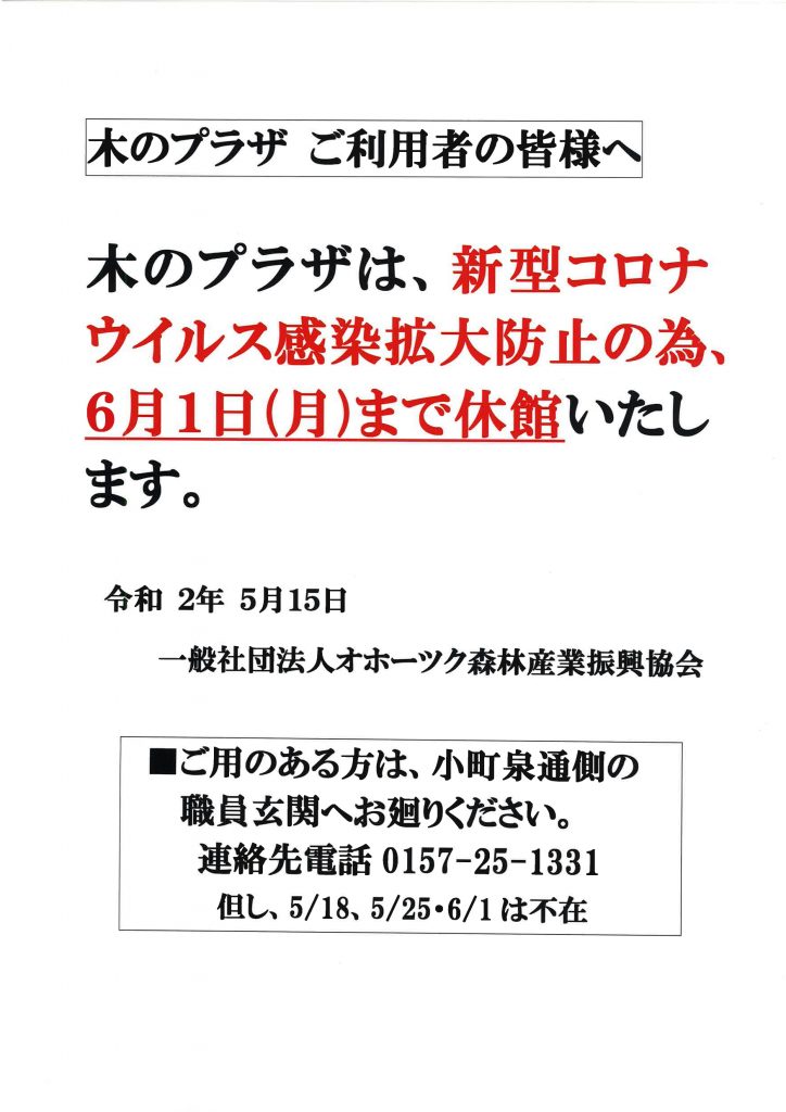 5月13日に北海道より「新型コロナウイルス感染症対策に関する今後の基本的な考え方」が示されたところであります。木のプラザにおいては、緩和対象外の施設になることから、臨時休館を5月31日(日)まで再延長することといたしましたのでお知らせいたします。状況により開館が早まる場合もありますので、その時はホームページ・SNS等でご報告いたします。