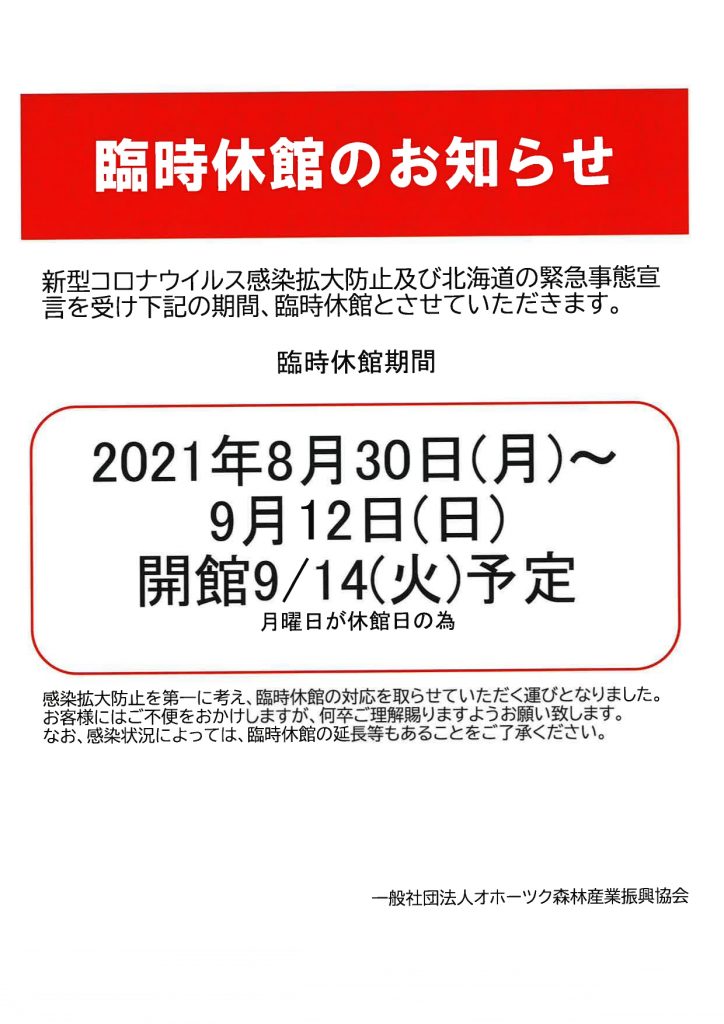 北海道に出された緊急事態宣言を受け、オホーツク木のプラザは新型コロナウイルス感染拡大防止として休館することとなりました。