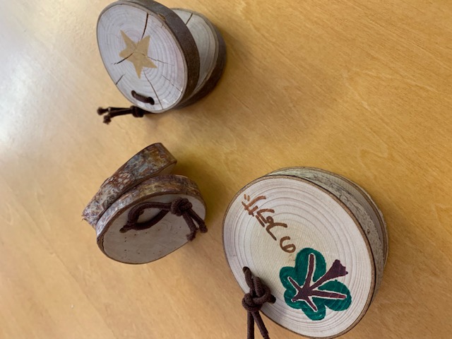 日曜日限定木工体験「森のカスタネットづくり」シラカバやサクラの輪切りでカスタネットを作ります。カチカチやさしい音色が響きますよ。