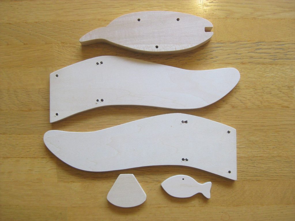 電動糸鋸で板をカモメや恐竜の形に切り抜いて