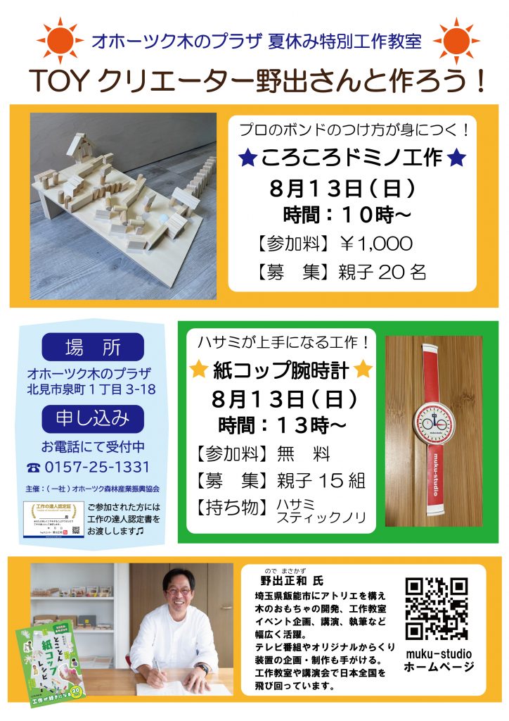 木のプラザ夏休み特別工作教室のお知らせです。