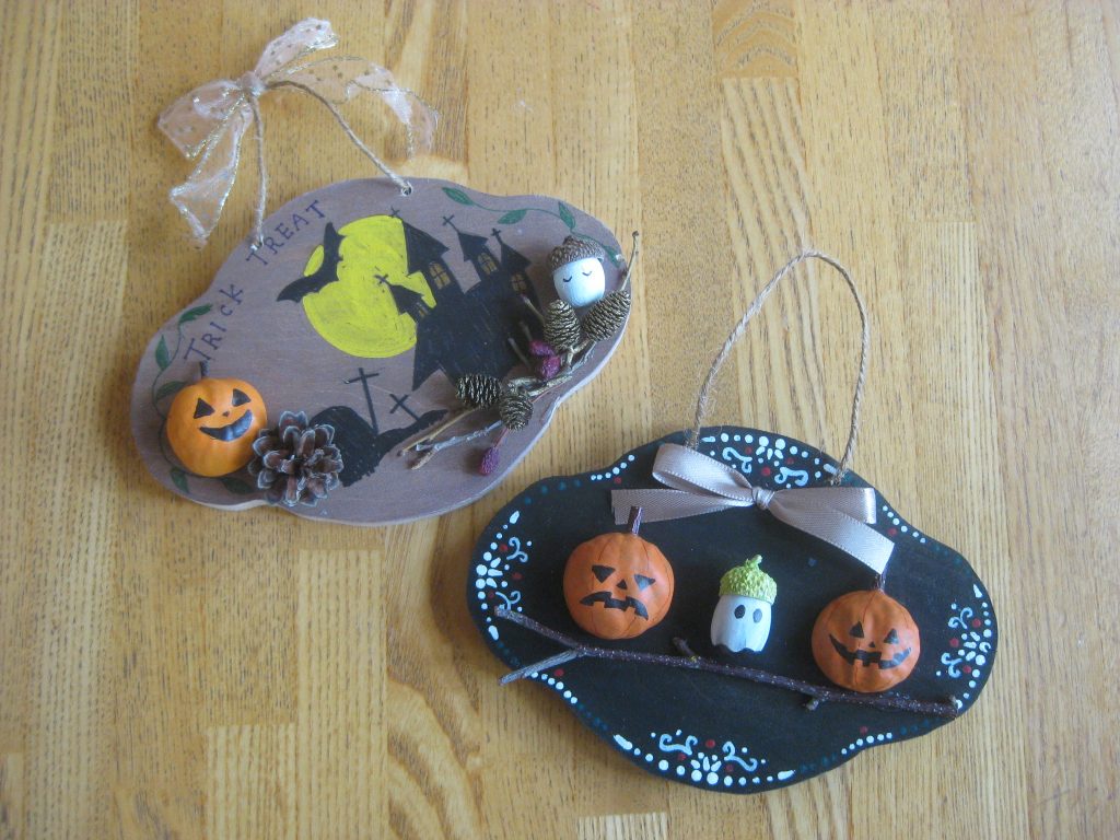 木のプレートにカボチャやオバケを貼り付けて壁掛けを作りましょう。