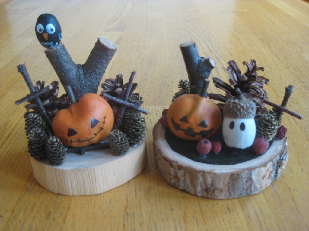 木の実のカボチャやオバケを貼り付けて、ハロウィンの飾りを作りましょう。