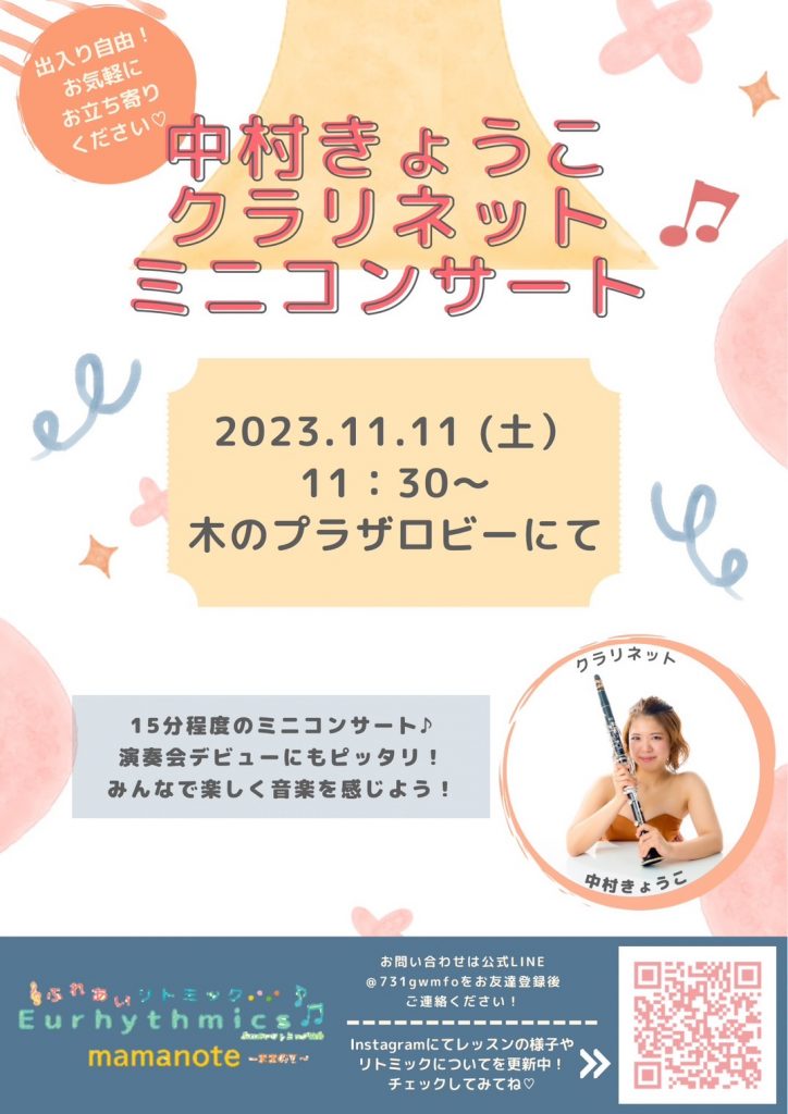 さらに今回もリトミックのきょうこ先生によるクラリネット演奏も楽しめますよ。