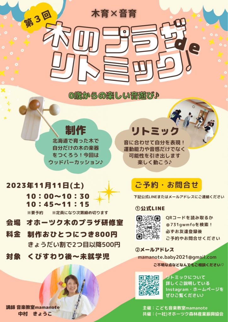 オホーツクで育ったトドマツでパーカッションを作って、リトミック(音楽遊び)をしてみませんか?