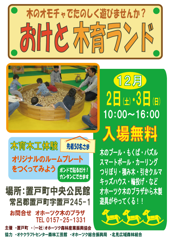 木のおもちゃで楽しく遊びましょう!木製遊具のゆうえんち木育ランドを置戸町で開催いたします。入場無料ですのでご家族でお越し下さい。