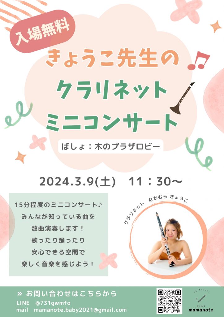 今回もリトミック終了後にロビーにてクラリネット演奏会を開催します。